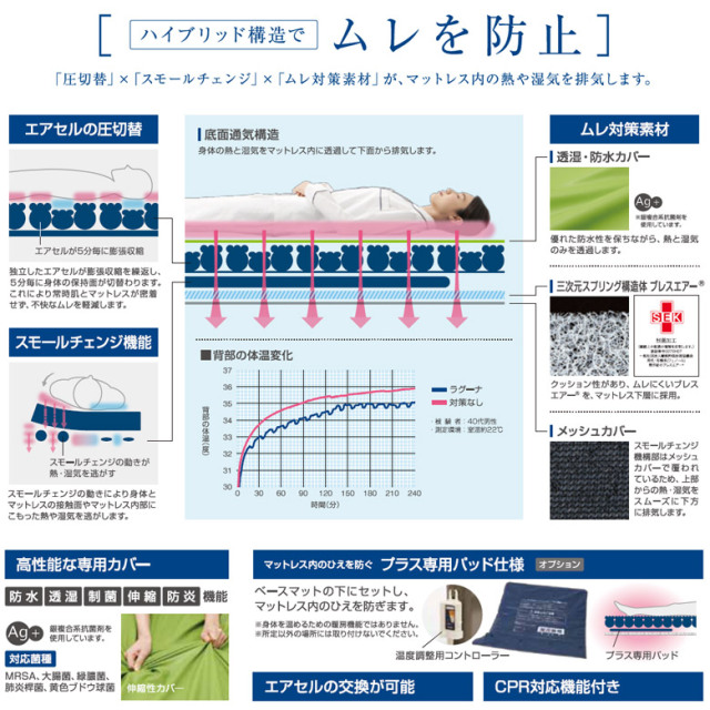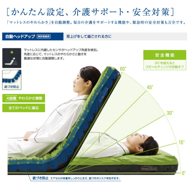 体圧分散・自動体位変換 ・体位変換を自動化したスモールチェンジ機能搭載 ・スモールチェンジで、床ずれ防止 ・「圧切替」×「スモールチェンジ」×「ムレ対策素材」で、ムレ防止 ・角度に応じて、マットレスのやわらかさと動きを自動調整 ・マットレスのやわらかさが自動的に調整(体重40~60kgに対応) |