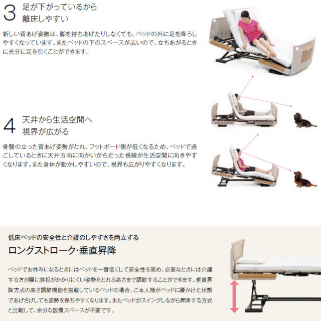 従来の背膝連動にベッドの傾斜を組み合わせた、4種類の背上げ機能と高さ調節を搭載しています。
