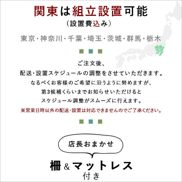 <<配送・設置は関東エリア限定(東京・神奈川・千葉・埼玉・茨城・群馬・栃木県のみ)>> ・商品を分解した状態で搬入し、宅内での設置作業となります。(作業時間は約30分程度) ・ご注文後、スケジュールの調整をさせていただきます。 なるべくお客様のご希望に沿うように努めますが、第3候補くらいまでお知らせいただけるとスケジュール調整がスムーズに行えます。 ※土日および17時以降の配送・設置は対応できませんのでご了承ください。 |