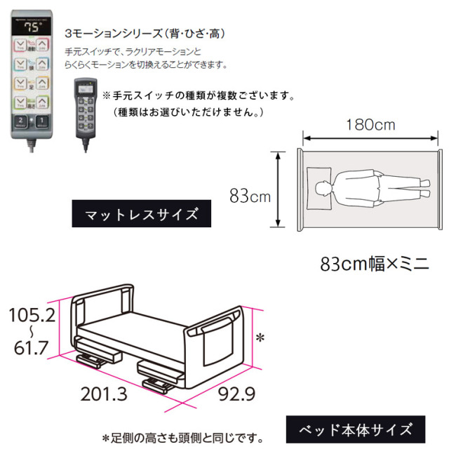 3モーター:ラクリア+らくらく+(背・膝・高さ)、セーフティーラウンドボード(樹脂ボード・木目シール) ベッド本体+柵(2本・新品)・マットレス(新品)の4点セットとなります。 ●新機構・ラクリアモーションに加え、背の角度とベッドの高さが個別に操作可能 ●高さ調整は21cmから64.5cmまでの垂直昇降方式 ●使いやすい表示パネル付き手元スイッチ ●適合するベッドオプションとの組み合わせにおいてJIS T 9254の認証を取得 |