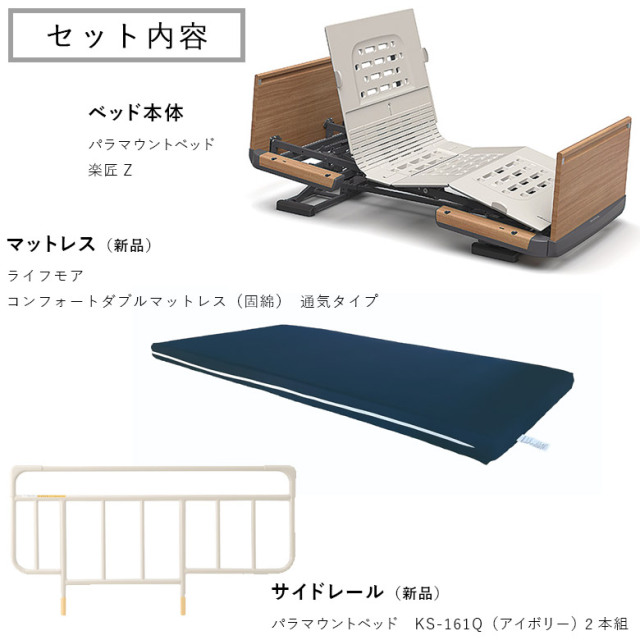 3モーター:ラクリア+らくらく+(背・膝・高さ)、木製ボード ●新機構・ラクリアモーションに加え、背の角度とベッドの高さが個別に操作可能 ●高さ調整は21cmから64.5cmまでの垂直昇降方式 ●使いやすい表示パネル付き手元スイッチ ●適合するベッドオプションとの組み合わせにおいてJIS T 9254の認証を取得 ベッド本体+柵(2本・新品)・マットレス(新品)の4点セットとなります。 |