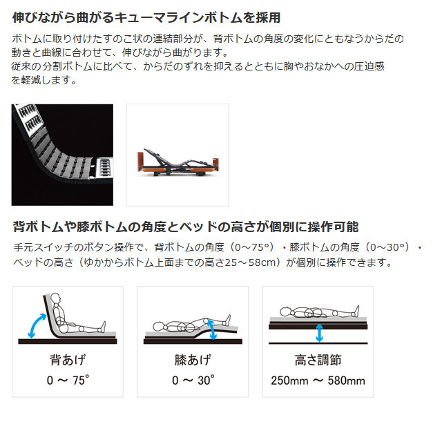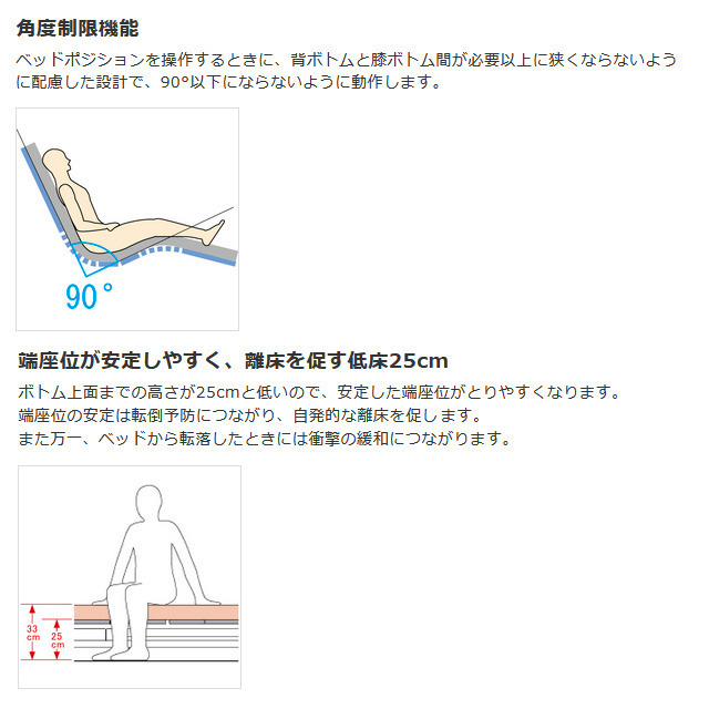 3モーター(背+膝+高さ)、樹脂ボード(木目ライトシール)、サイド木目 足をしっかりとゆかにつけられる低床25cm。 3モータータイプの電動ベッドです。 ●手元スイッチで、背や膝の角度とベッドの高さが個別に操作可能 ●端座位が安定しやすく、離床を促す低床25cm ●ベッドの操作内容を確認できる「操作履歴ONLINE」 ●木目のデザインを加えた軽量な樹脂製ボード ●運転音の静かな新開発のアクチュエーター ※ベッド本体、柵、マットレス(いずれも中古品)の3点セットとなります。 |