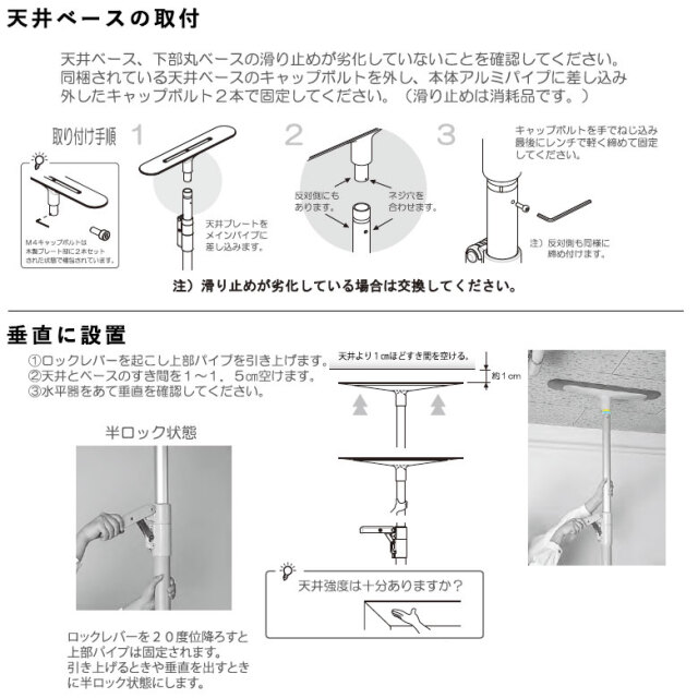 | 取り付け天井高:1.7~2.1m・天井設置面60×11cm・床設置面直径16cm・握り部直径4.5cm |