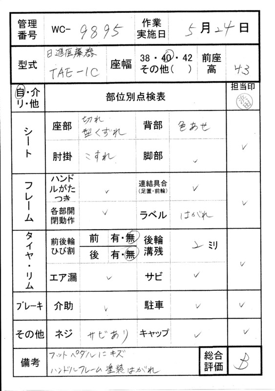 座部型崩れ・切れ、背部色あせ、ひじ掛け擦れ、ネジにサビ