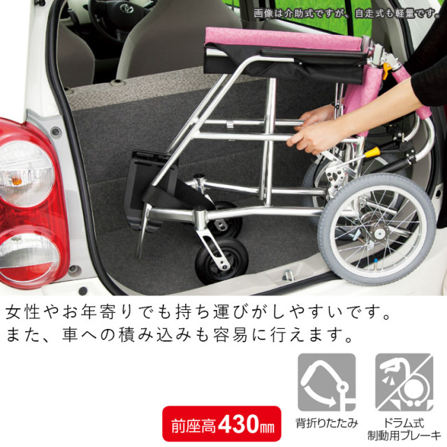 ※ハンドリムは波型プラスチックリング仕様 超軽量スタンダードタイプ 材質:アルミ 自走or介助:自走式 背折:有 介助ブレーキ:有 肘上:無 フットスイング:無 |